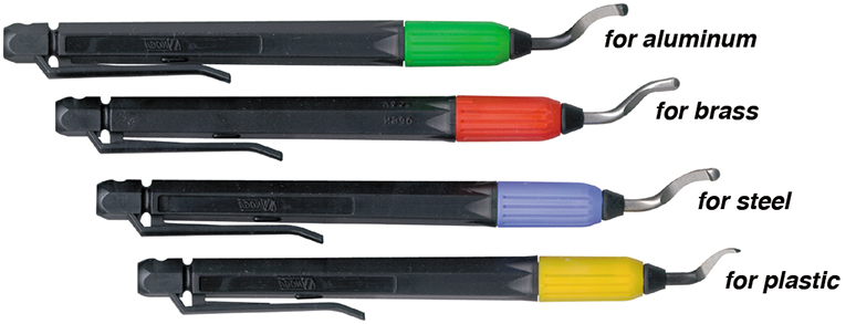 • Unique rounded head blades for safe deburring of drilled and machined holes, end milled areas, tubing, backside of holes and an almost unlimited amount of uses