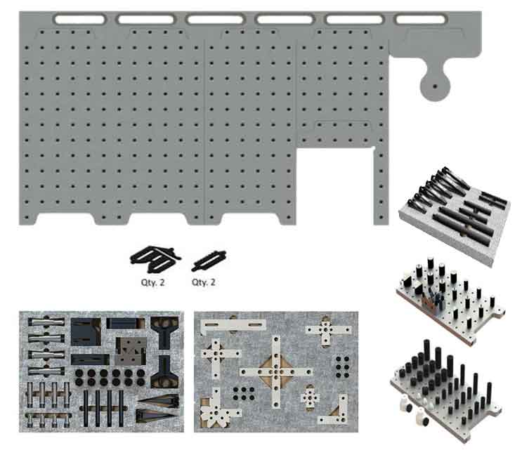 WORKS Kit includes: (4 ea.) Cross-Bow™ and D-Block clamps; (2) Trigger-Block™ clamps, (2) Trigger-Finger™ hold-downs with (4) 3” steel shafts, (4 ea.) 1, 2, and 3” Silver-Bullet™ stand-offs, (7) Simple-Stop™ rails and stops; (2) Spring-Loc™ clamps; (2) Sliding Stop™ stops; (2) Hole Adjusters; (2) V-Blocks; (34) Stand-off & Rest Pad set; (18) Magnetic Riser Set; (2 ea.) sturdy lever clamps 1.5″, 2.5″ and 3.5″ (shafts included) plus hex key, thumb and button-head screws.