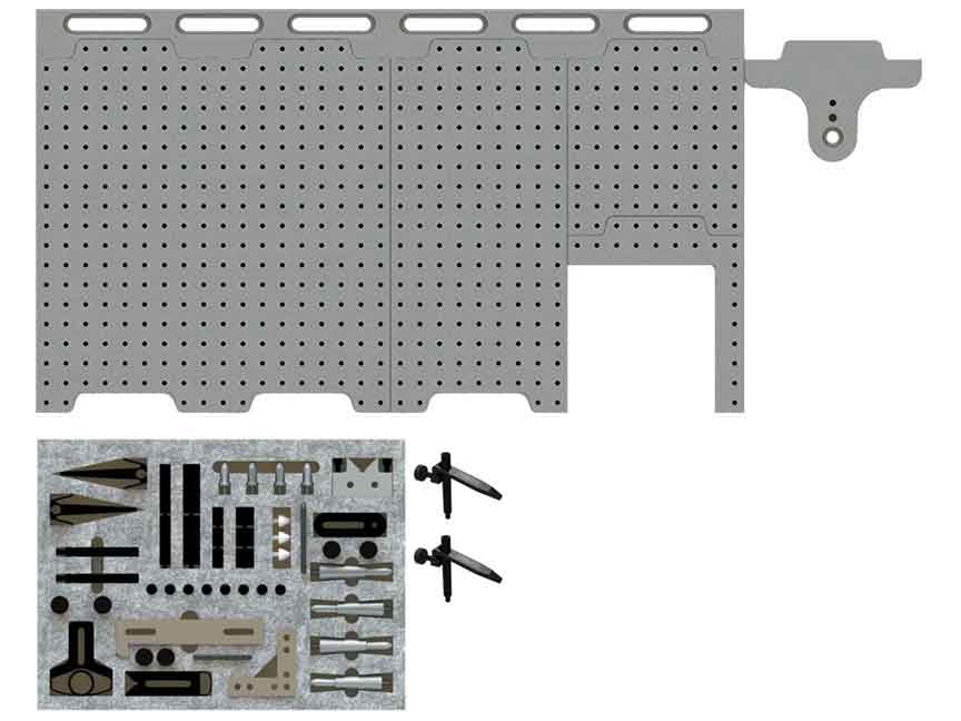 PLUS TR-KIT-03M Starter Work Holding Kit containing non-marring hold downs, v-blocks, stops, and stand-offs.
