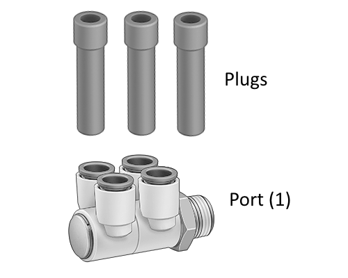 - RL-Port-Plugs: Multi-Vise Connector Port: 1/8″ tube to 1/8″ NPT 4 port w/3 plugs