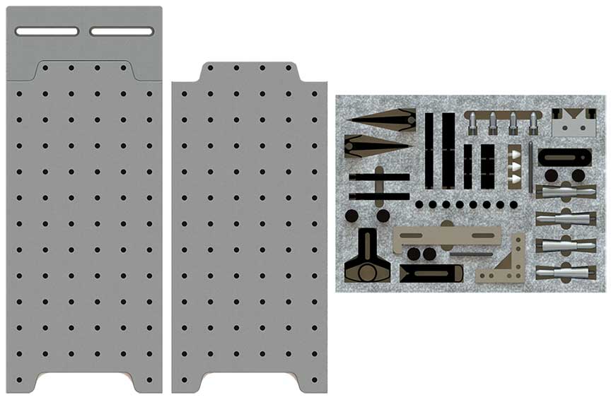 (2 ea.) Cross-Bow™ and D-Block clamps; (2) Trigger-Finger™ hold-downs with (4) 3” steel shafts; (4 ea. ) 1, 2, and 3” Silver-Bullet™ stand-offs, (2 ea.) V-Block stand-offs, Hole Adjusters, Simple-Stop™ #-01, #-07 stops; plus hex key, thumb and button-head screws, 5-S Foam drawer inserts.