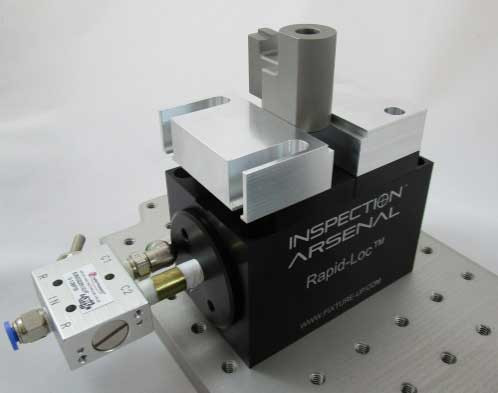Mount Rapid-Loc™ vises on Inspection Arsenal™ Loc-N-Load™ quick-swap fixture plates for fast, accurate, and highly repeatable setups that help break inspection bottlenecks. Rapid-Loc™ can also be mounted on existing CMM breadboards. The black anodized, aluminum Rapid-Loc™ pneumatic vise is currently available with a 2.5”x 3.5” footprint, .06” travel, 150-lbs of force. Secure Rapid-Loc™ with standard or metric thread screws.