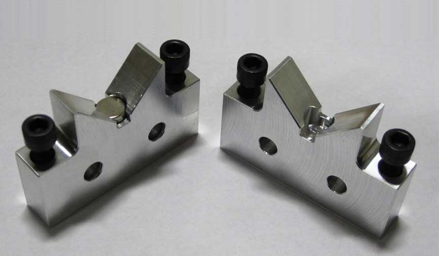 V-Block, magnetic, aluminum stand-off. Set of two. Use vertically or horizontally as a stop to create simple setups. Add 76mm steel shafts to gain height. Sizes: 90° included angle.